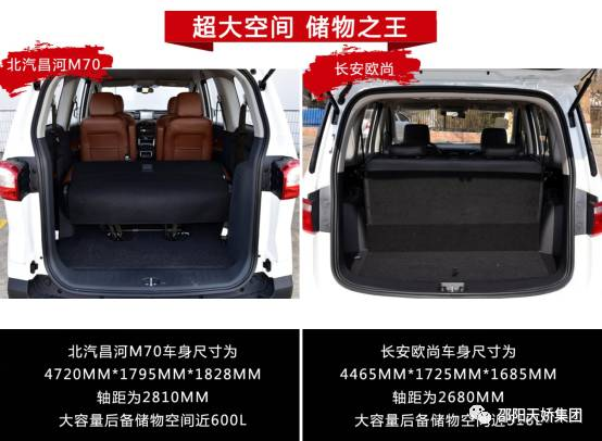 對于從旅行轎車演變而來的MPV來講,大空間是必備需求。而從數(shù)據(jù)來看,無論長、寬、高還是整體空間,乃至軸距,北汽昌河M70都比長安歐尚大了一圈。而折算下來,單后備儲物空間一項(xiàng),北汽昌河M70的近600L空間就比長安歐尚的近516L大了84L。同為7座車,儲物能力更強(qiáng),宜商宜家絕對沒話說