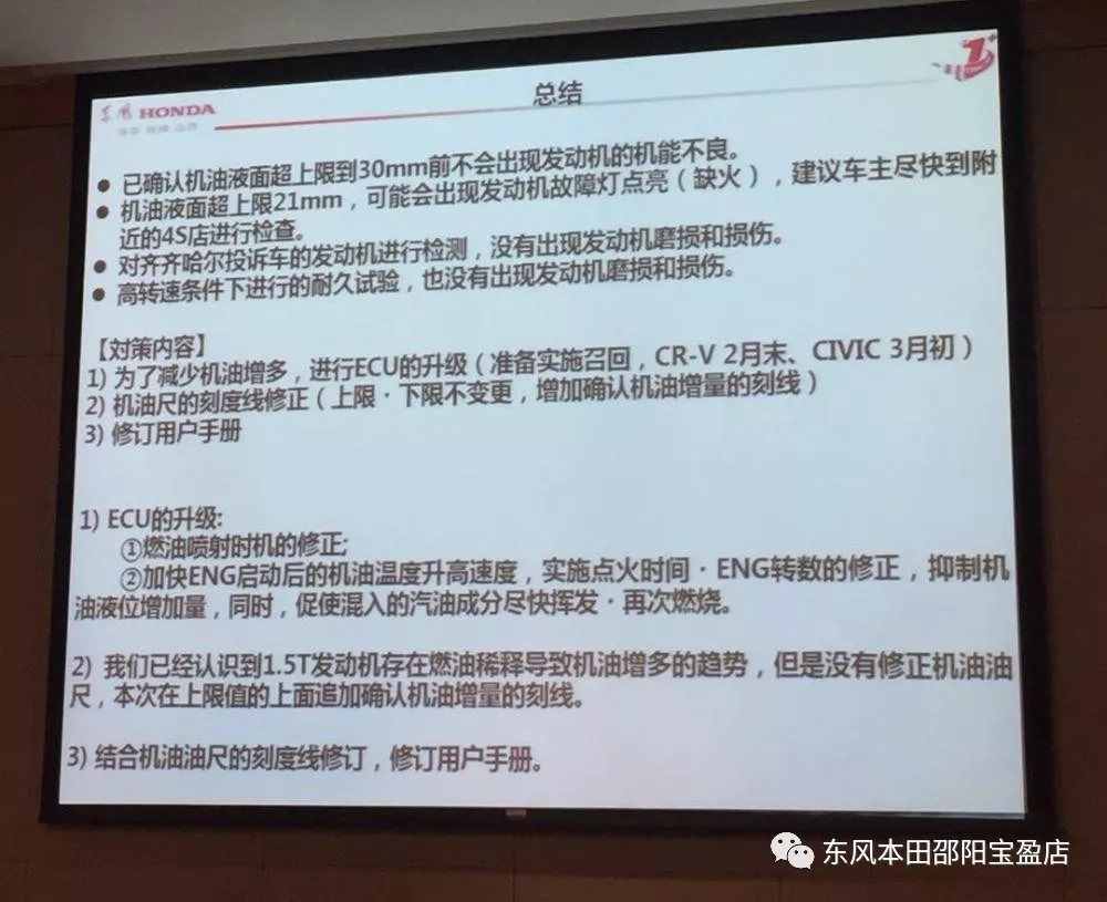 今日東風(fēng)本田官方正式公布關(guān)于1.5T發(fā)動(dòng)機(jī)機(jī)油液位升高的相關(guān)問(wèn)題的調(diào)查報(bào)告,并公布解決方案。東風(fēng)本田宣布,為了減少機(jī)油增多,進(jìn)行ECU升級(jí)(準(zhǔn)備實(shí)施召回,CR-V在2月末、CIVIC在3月初);機(jī)油尺的刻度線修正,上限下限不變更,增加確認(rèn)機(jī)油增量的刻線;修訂用戶手冊(cè)。