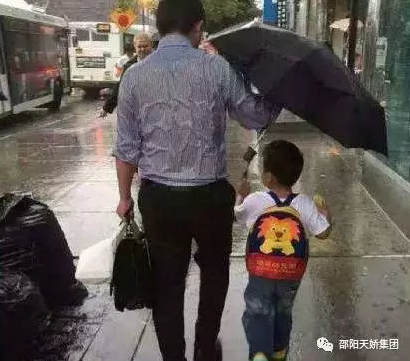 爸爸為了不讓孩子淋雨,把唯一的雨傘全部遮在孩子頭上,自己卻渾身濕透。