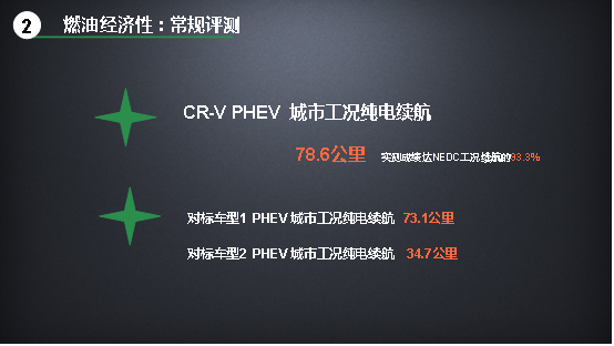 CR-V 銳·混動e+城市工況和高速工況純電續(xù)航里程均長于兩個對標(biāo)車型。