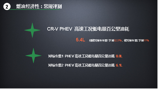 然后我們對比一下CR-V銳·混動e+與對標(biāo)車型的油耗差別。城市油耗和高速油耗,CR-V銳·混動e+是4.9L和5.4L,對標(biāo)車型1則是7.1L/8.0L,對標(biāo)車型2是5.7L/6.1L。