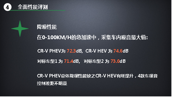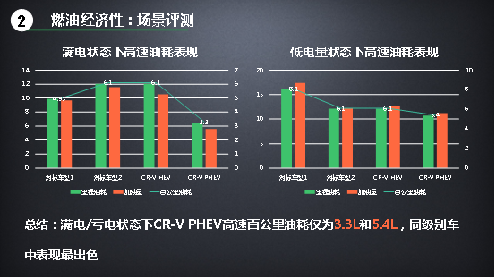 需要提示的是,這個曲線是在車輛滿電、均速22.3km/h的工況下測試獲得的,并且圖表只展示到300公里的趨勢預(yù)測,因此出現(xiàn)了三款PHEV車型的油耗均低于CR-V銳·混動的情況。伴隨著里程的進(jìn)一步延長,或者直接以低電量工況測試,對標(biāo)車型1和對標(biāo)車型2的油耗數(shù)據(jù)會持續(xù)增長并超過CR-V銳·混動的油耗(其中對標(biāo)車型1會達(dá)到7.1L左右,對標(biāo)車型二會達(dá)到5.7L左右),而CV-R銳·混動e+的峰值則只會與CR-V銳·混動接近(4.9L左右)。