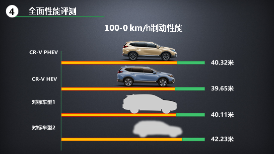 雖然不屬于主要的關(guān)注點(diǎn),但我們還是對性能層面進(jìn)行了測試。對應(yīng)的結(jié)果是,除了百公里加速,其他各項(xiàng)測試成績都是CR-V銳·混動e+最優(yōu)。